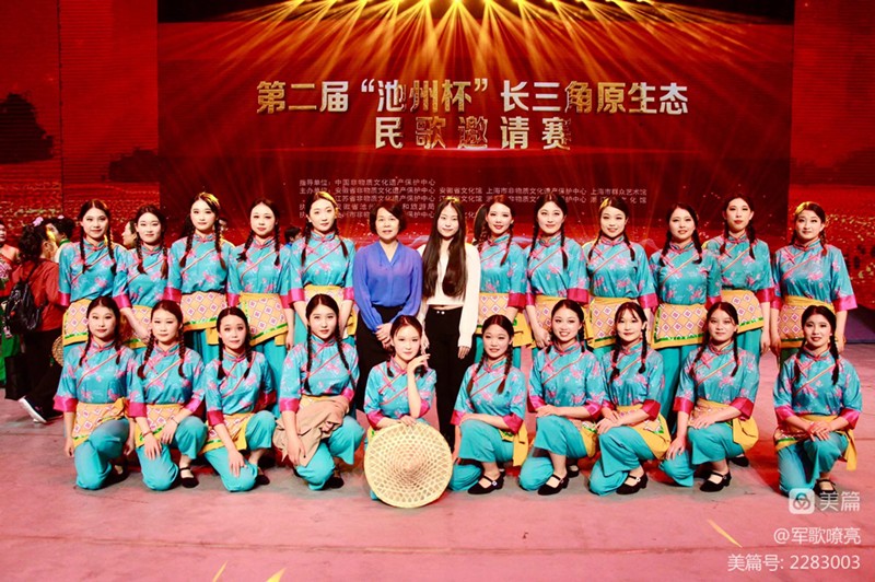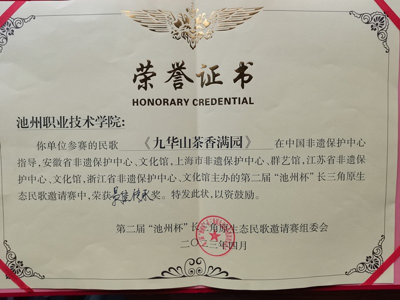经过激烈角逐,由池州市文化和旅游局选送的我院教育系21级学前专业24名同学与九华民歌传承人共同参演的节目《九华民歌·九华山茶香满园》获最佳传承奖。